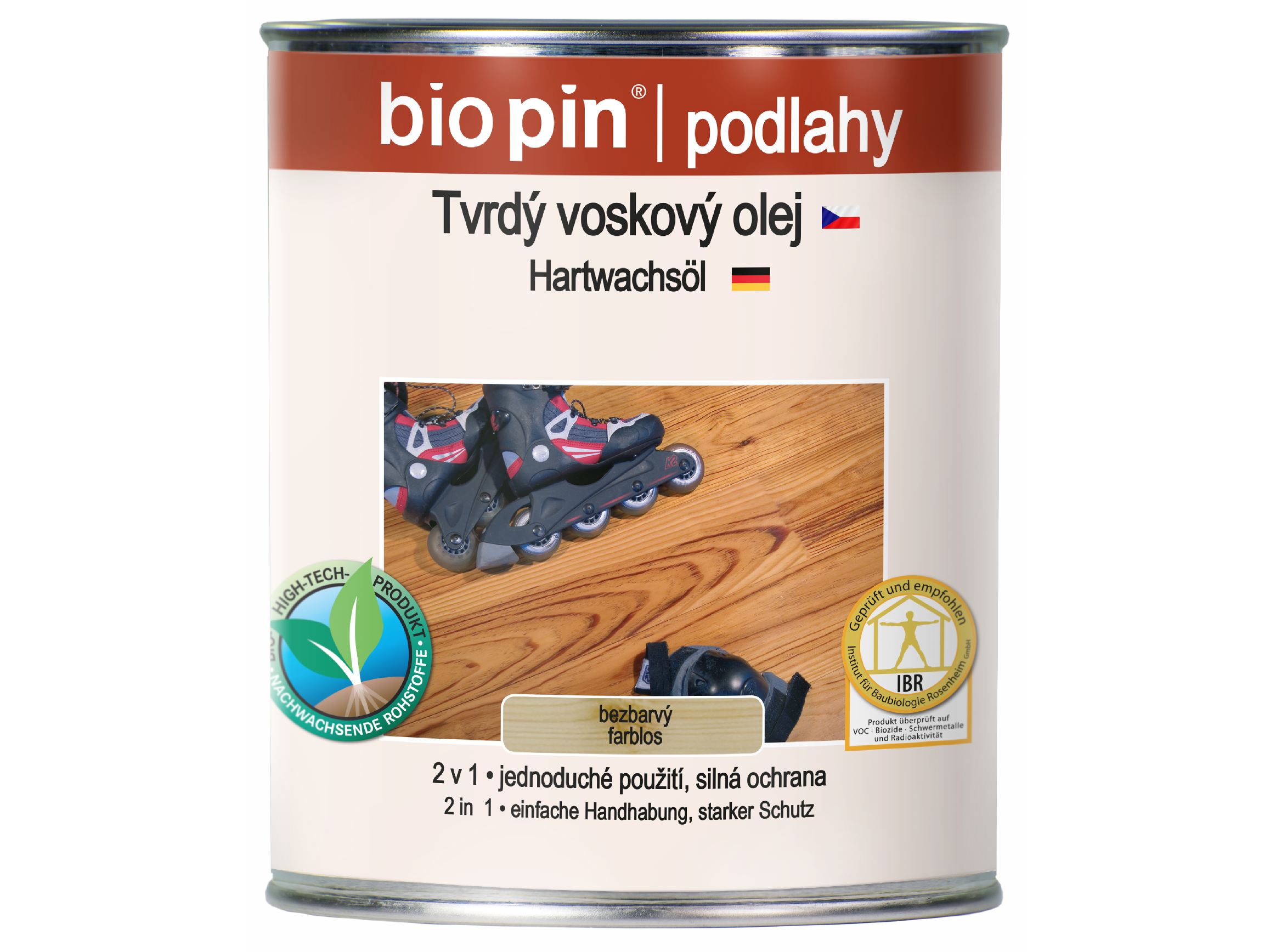 Bezbarvá kombinace oleje, pryskyřice a vosku s obsahem rozpouštědla, z obnovitelných surovin, čistě rostlinné oleje, pryskyřice a vosky, velmi odolný, odpuzující vodu a nečistoty